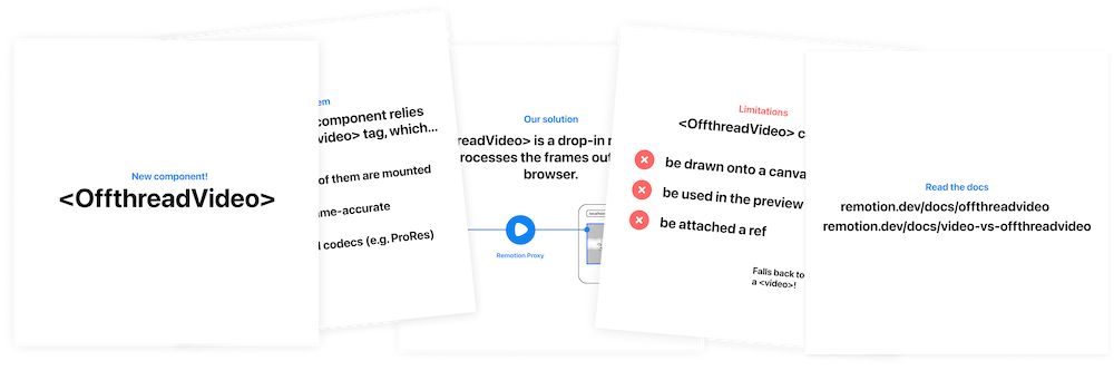 The new <Thumbnail> component is like the <Player>, but for rendering a preview of a still. You can use it to display a specific frame of a video without having to render it.